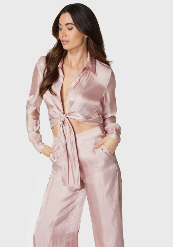 Bebe Tops | Iridescent Satin Tie Front Collared Blouse Rose Champagne Women